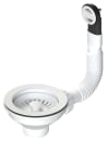 Dette afløbssæt inkluderer en kurveventil og kurv, et rundt overløb med en elegant dækplade samt en fleksibel overløbsslange.
