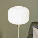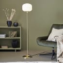 Sober gulvlampe fra Markslöjd. Gulvlampe med Base i børstet messing og hvid glasskærm. Skærmens diameter er 25 cm. 2 m transparent kabel med indbygget afbryder. E27 fatning. Max 1x40W glødepære eller tilsvarende i LED. Pære medfølger ikke.