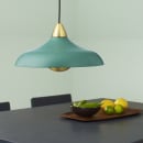 Pendlen er udstyret med et stilfuldt messingmalet rør, der tilføjer et strejf af elegance og kontrast til den grønne farve. Ikke nok med det, så har pendlen en messingmalet indsats, som delvist dækker pæren for blændfri belysning.