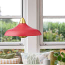 Pendlen er udstyret med et stilfuldt messingmalet rør, der tilføjer et strejf af elegance og kontrast til den røde farve. Ikke nok med det, så har pendlen en messingmalet indsats, som delvist dækker pæren for blændfri belysning.