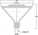 Dekorativ udendørs armatur med gadedistribution. Udstyret med kredsløb til 50% effektreduktion, der er effektivt 3 timer før og 5 timer efter midnat. Det kan deaktiveres ved installationen med en lettilgængelig intern switch. Klasse II elektrisk, IP66, IK08. Base og arme: støbt aluminium (EN AC-46000), Baldakin: drejet aluminium, alt pulverlakeret i mørk sandgrå 900 (tæt på RAL7043). Diffusor: klar polycarbonat. Skruefastgørelser: rustfrit stål. Leveres komplet i en kasse, forudkablet med 4m HO5 VVF-kabel. Overspændingsbeskyttelse: 10kV enkeltimpuls fælles tilstand og 8kV flerimpuls fælles tilstand samt 6kV flerimpuls differentiel tilstand. Hvis der er tilsluttet permanent DALI-system, 6kV flerimpuls fælles og differentiel tilstand. Komplet med 4000K LED