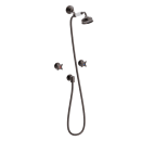 Dette brusesæt med indbygget armatur i bruneret messing forener ikonisk dansk design med kompromisløs funktionalitet. Sættet er inspireret af klassiske linjer og krydsgreb, der siden 1922 har været foretrukket af anerkendte arkitekter som Henning Larsen og Jørn Utzon til prestigefyldte byggerier verden over.