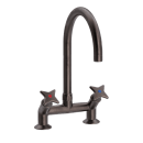 Armaturet monteres nemt på bord eller vask og betjenes intuitivt med de ikoniske krydsgreb, som har været foretrukket af anerkendte arkitekter siden 1922. Den brunerede overflade fremhæver armaturets rene linjer og gør det til et naturligt midtpunkt i køkkenet. Med keramiske ventiler og fleksibel montering får du en løsning, der kombinerer klassisk æstetik med moderne komfort.