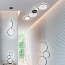 Rondo-loftlampen fra Trio Lighting er udformet i et helt særligt design af sammensatte, åbne, lysende cirkler. Cirklerne har LED belysning rundt i "kanten", der spreder et varmt hvidt lys på 3000K.