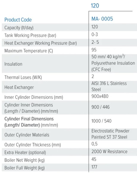 - 120 liter med stor spiraloverflade på 1,59 m²