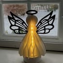 Papirets fold og engelens silhuet danner en elegant figur, der fanger lyset på en måde, der minder om stille sne og decemberro. Den diskrete halo og grafiske vinger tilføjer kant til det ellers bløde udtryk, så du nemt kan kombinere den med andet dekorationslys – eller lade den stå alene.