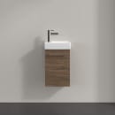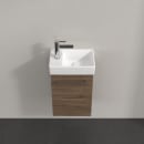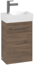 Den varme farve i brun eg tilfører et naturligt og moderne udtryk, mens den højrevendte låge med greb gør det let at få adgang til indholdet. Soft close funktionen sikrer, at døren altid lukker lydløst og blidt, hvilket giver en behagelig oplevelse i hverdagen.