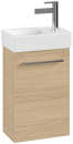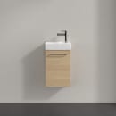 Skabet er udstyret med en venstrehængslet låge og har et diskret greb, der gør det let at åbne og lukke. Soft-close funktionen sikrer, at lågen lukker blidt og lydløst, hvilket bidrager til en behagelig og rolig atmosfære i rummet.
