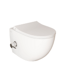 Den indbyggede douchefunktion giver en skånsom og grundig intimvask. Vandets temperatur justeres med det integrerede greb på toilettets side. Da løsningen er manuel og ikke kræver strøm, er den nem at installere og anvende, da der kun skal tilsluttes varmt vand.