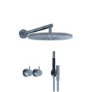 Vola 060 hovedbruseren markerer en vigtig milepæl, som den første cirkulære bruser i Volas sortiment. Hovedbruseren kombineres her med de elegante og veldesignede greb og den runde T2 håndbruser med sort greb.