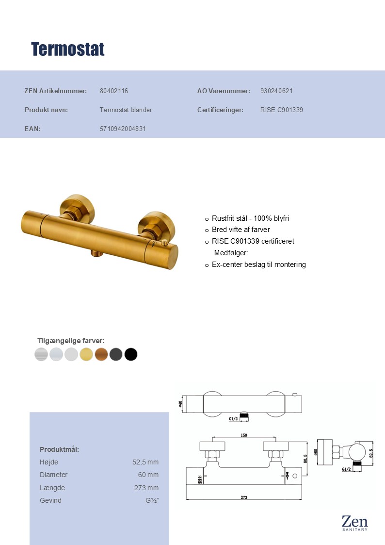 Zen brusearmatur i messing med termostat og sikkerhedsspærre