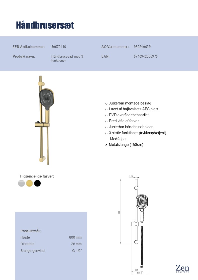 Zen brusesættet i mat messing passer ind i de fleste badeværelsesmiljøer og giver dig både funktionalitet og et tidløst udtryk. De tre stråletyper gør det let at tilpasse brusebadet til netop dine ønsker, og den justerbare stang sikrer, at hele familien får glæde af sættet.