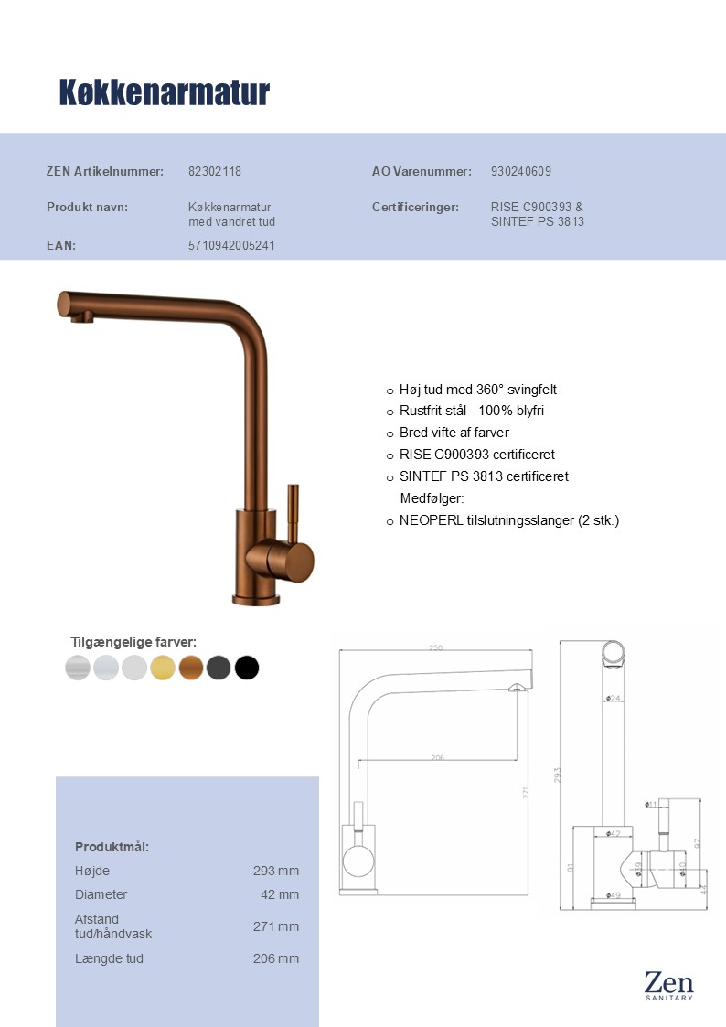 Den høje tud med 360° svingfelt gør det nemt at fylde gryder eller rengøre store fade, og den enkle betjening med ét greb sikrer, at du nemt kan justere vandtemperaturen. Køkkenarmaturet er fremstillet i 100% blyfrit rustfrit stål med kobberfinish og leveres med fleksible NEOPERL-slanger, så montering bliver enkel og hurtig. Vælg denne køkken vandhane, når kun det bedste er godt nok til din hverdag.