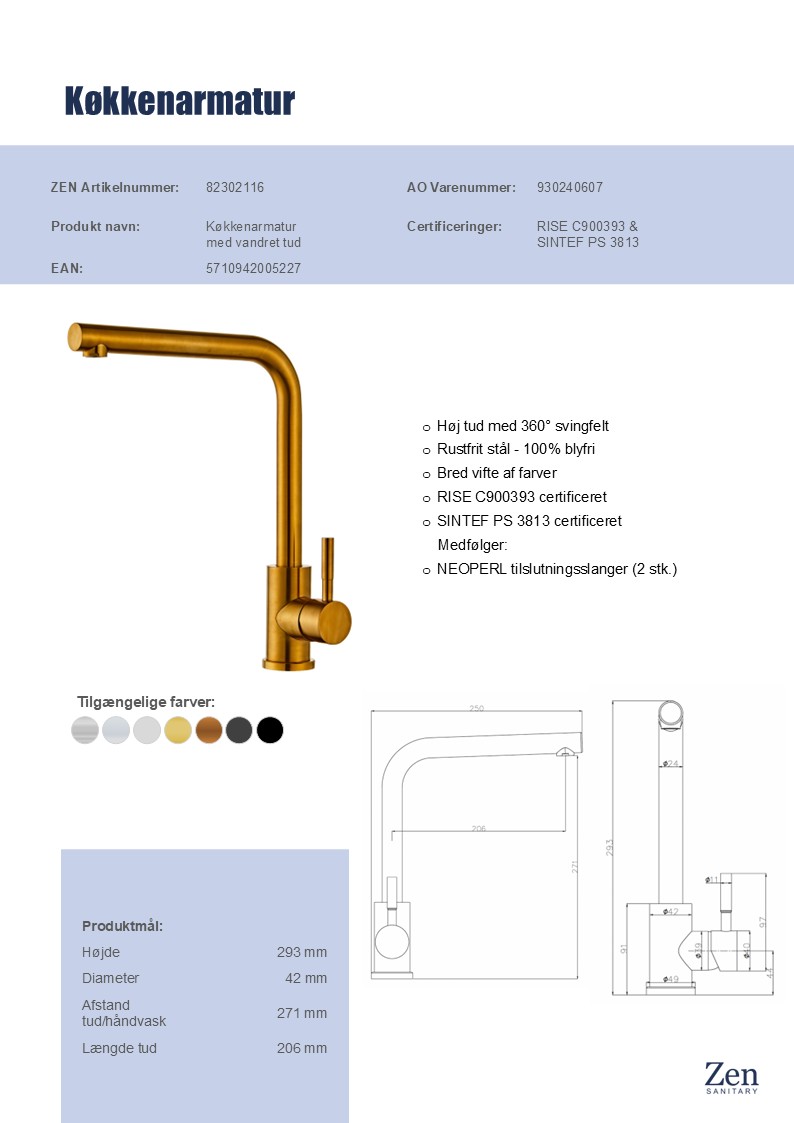 Den høje tud med 360° svingfelt gør det nemt at fylde gryder eller rengøre store fade, og den enkle betjening med ét greb sikrer, at du nemt kan justere vandtemperaturen. Armaturet er fremstillet i 100% blyfrit rustfrit stål med mat messingfinish og leveres med fleksible NEOPERL-slanger, så montering bliver enkel og hurtig. Vælg dette køkkenarmatur, når kun det bedste er godt nok til din hverdag.