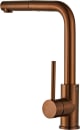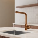 Med sit minimalistiske og afrundede design passer denne køkken vandhane ind i enhver indretning. Udtræksslangen gør det let at nå alle hjørner af vasken, og den høje L-tud giver plads til selv store gryder. Den matte kobberoverflade i rustfrit stål er nem at holde ren og bevarer sit flotte udtryk år efter år.