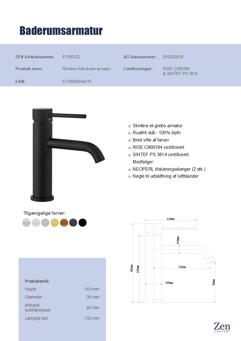 Vælg Zen Slimline håndvaskarmatur, hvis du ønsker et gennemført look og en vandhane, der lever op til de højeste standarder for både design og funktionalitet.