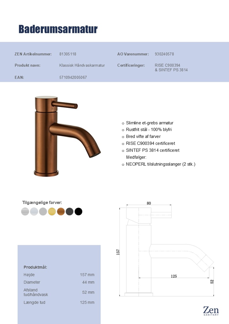 Zen Slimline håndvaskarmatur er skabt til at være både funktionelt og æstetisk. Den cylinderformede krop og det runde greb skaber en harmonisk helhed, der matcher både klassiske og moderne badeværelsesmiljøer. Den børstede kobberfinish fremhæver armaturets rene linjer og gør det nemt at holde pænt.