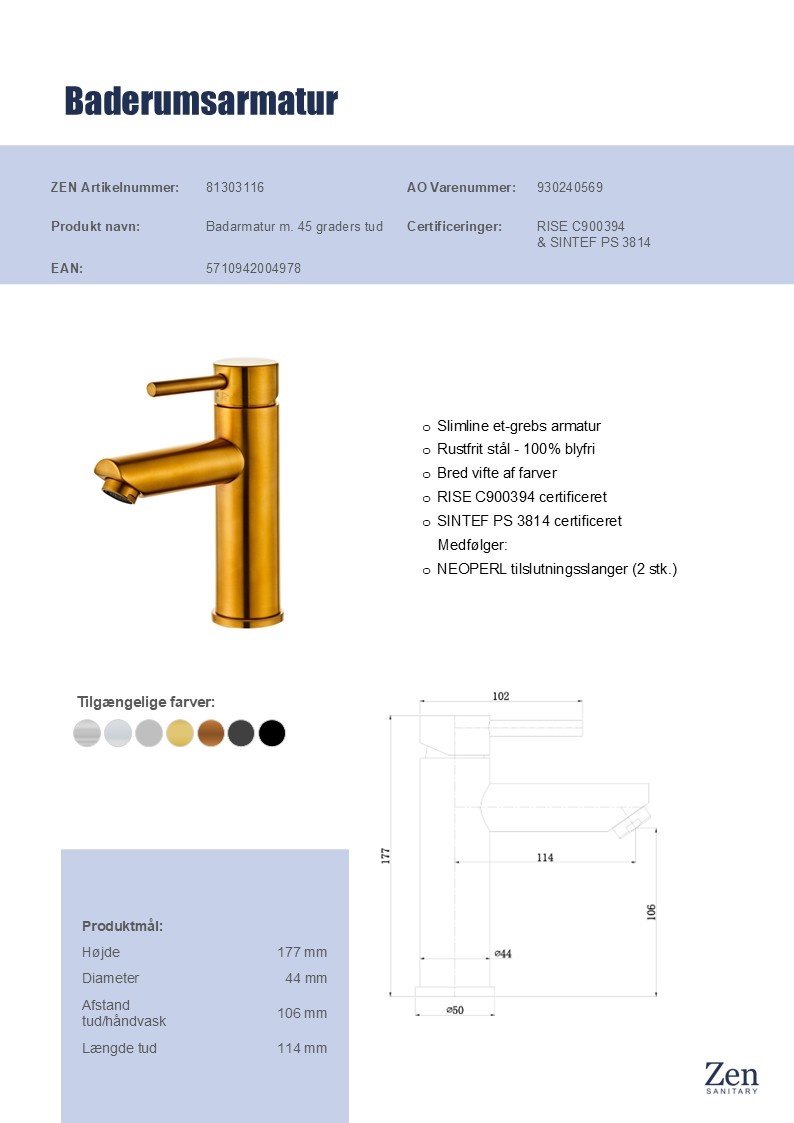 Med Zen Slimline får du mere end bare en vandhane – du får et gennemført design, hvor kvalitet og æstetik går hånd i hånd. Det 100% blyfri rustfri stål sikrer et sundt valg, mens det minimalistiske udtryk giver badeværelset et smukt løft.